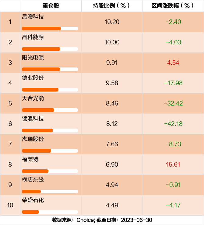 广发诚享混合C前十大重仓股分别是晶澳科技,晶科能源,阳光电源,德业股份,天合光能,锦浪科技,杰瑞股份,福莱特,横店东磁,荣盛石化,前十大重仓股合计持股占总持仓比例80.26%。