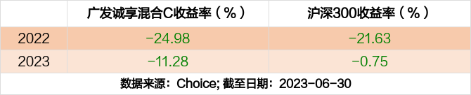 2023年度,截止至6月30日,广发诚享混合C基金收益-11.28%,同期沪深300收益-0.75%,同类排名3084/3541。
