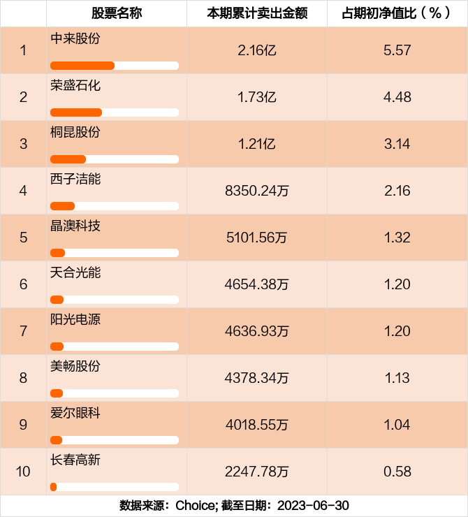 本期基金累计卖出金额最高的前十大个股分别是中来股份,荣盛石化,桐昆股份,西子洁能,晶澳科技,天合光能,阳光电源,美畅股份,爱尔眼科,长春高新。