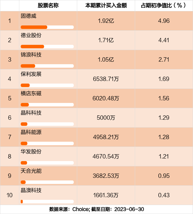 本期基金累计买入金额最高的前十大个股分别是固德威,德业股份,锦浪科技,保利发展,横店东磁,晶科科技,晶科能源,华发股份,天合光能,晶澳科技。