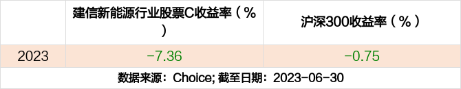 2023年度,截止至6月30日,建信新能源行业股票C基金收益-7.36%,同期沪深300收益-0.75%,同类排名668/850。