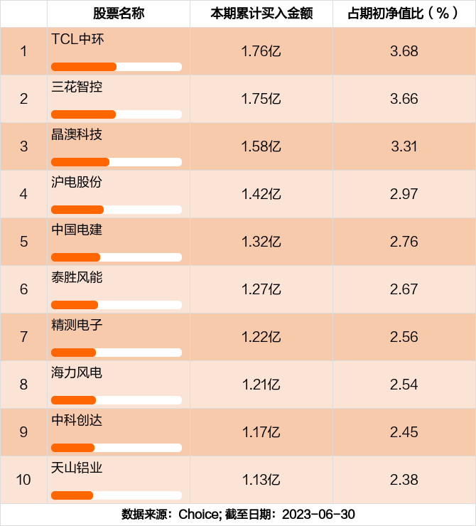 本期基金累计买入金额最高的前十大个股分别是TCL中环,三花智控,晶澳科技,沪电股份,中国电建,泰胜风能,精测电子,海力风电,中科创达,天山铝业。