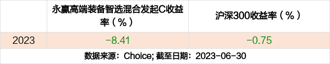 2023年度,截止至6月30日,永赢高端装备智选混合发起C基金收益-8.41%,同期沪深300收益-0.75%,同类排名3152/3541。