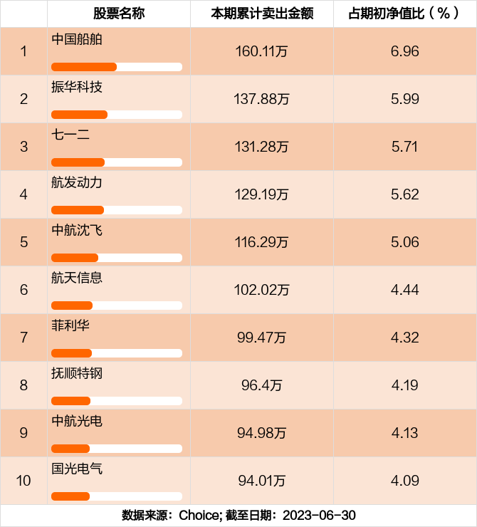 本期基金累计卖出金额最高的前十大个股分别是中国船舶,振华科技,七一二,航发动力,中航沈飞,航天信息,菲利华,抚顺特钢,中航光电,国光电气。