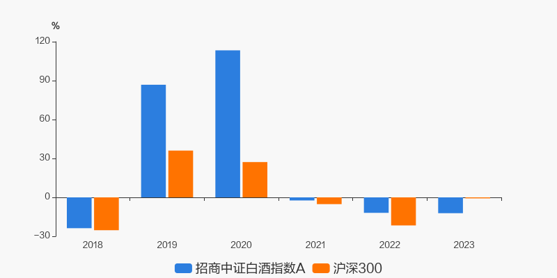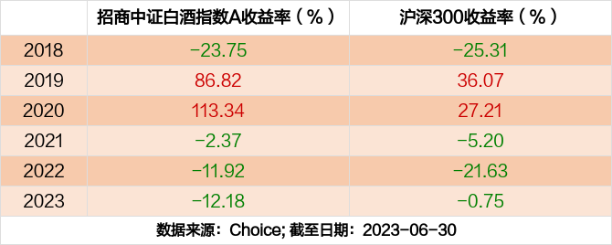 2023年度,截止至6月30日,招商中证白酒指数A基金收益-12.18%,同期沪深300收益-0.75%,同类排名1599/1788。