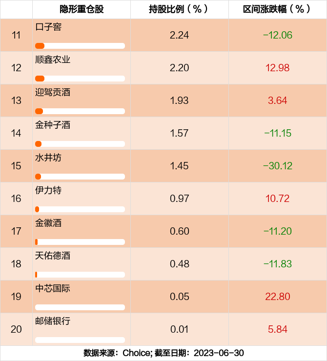 根据招商中证白酒指数A2023年半年报,该基金持仓比例排名11到20个股依次为:口子窖,顺鑫农业,迎驾贡酒,金种子酒,水井坊,伊力特,金徽酒,天佑德酒,中芯国际,邮储银行。