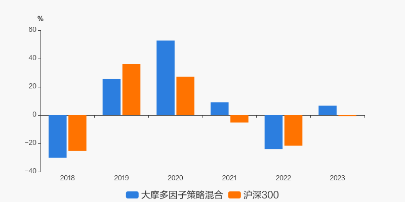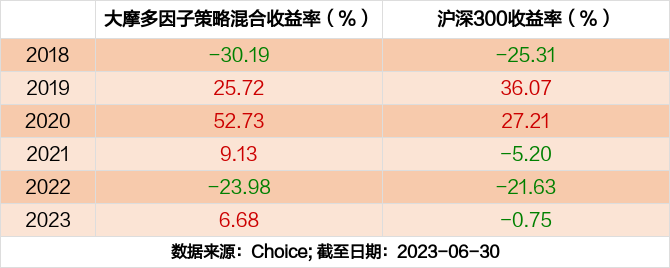 2023年度,截止至6月30日,大摩多因子策略混合基金收益6.68%,同期沪深300收益-0.75%,同类排名597/3541。