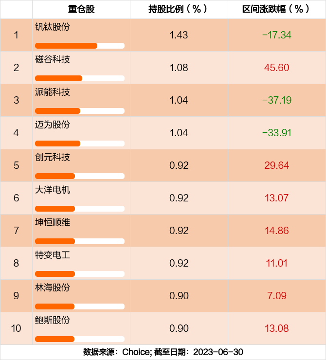 大摩多因子策略混合前十大重仓股分别是钒钛股份,磁谷科技,派能科技,迈为股份,创元科技,大洋电机,坤恒顺维,特变电工,林海股份,鲍斯股份,前十大重仓股合计持股占总持仓比例10.07%。