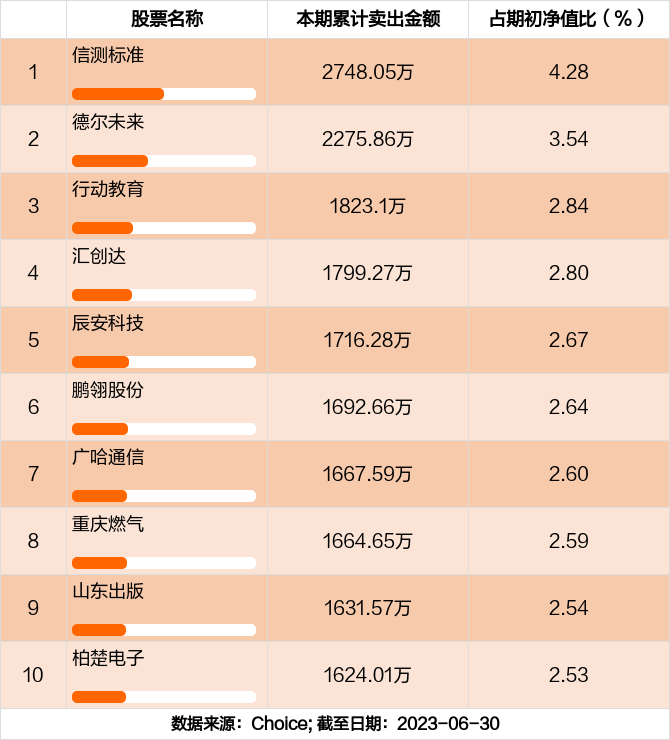 本期基金累计卖出金额最高的前十大个股分别是信测标准,德尔未来,行动教育,汇创达,辰安科技,鹏翎股份,广哈通信,重庆燃气,山东出版,柏楚电子。