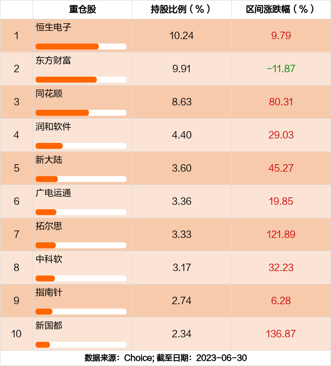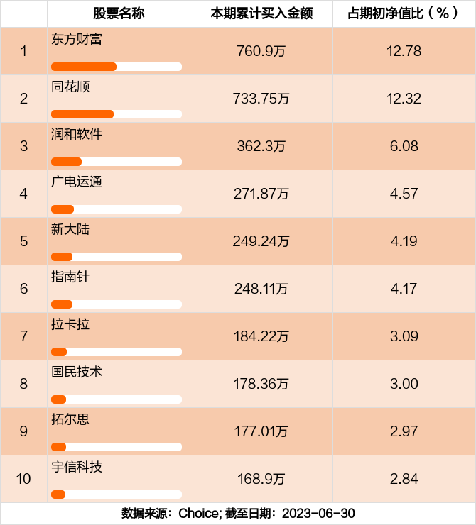本期基金累计买入金额最高的前十大个股分别是东方财富,同花顺,润和软件,广电运通,新大陆,指南针,拉卡拉,国民技术,拓尔思,宇信科技。
