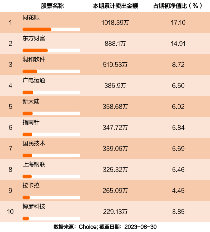本期基金累计卖出金额最高的前十大个股分别是同花顺,东方财富,润和软件,广电运通,新大陆,指南针,国民技术,上海钢联,拉卡拉,博彦科技。
