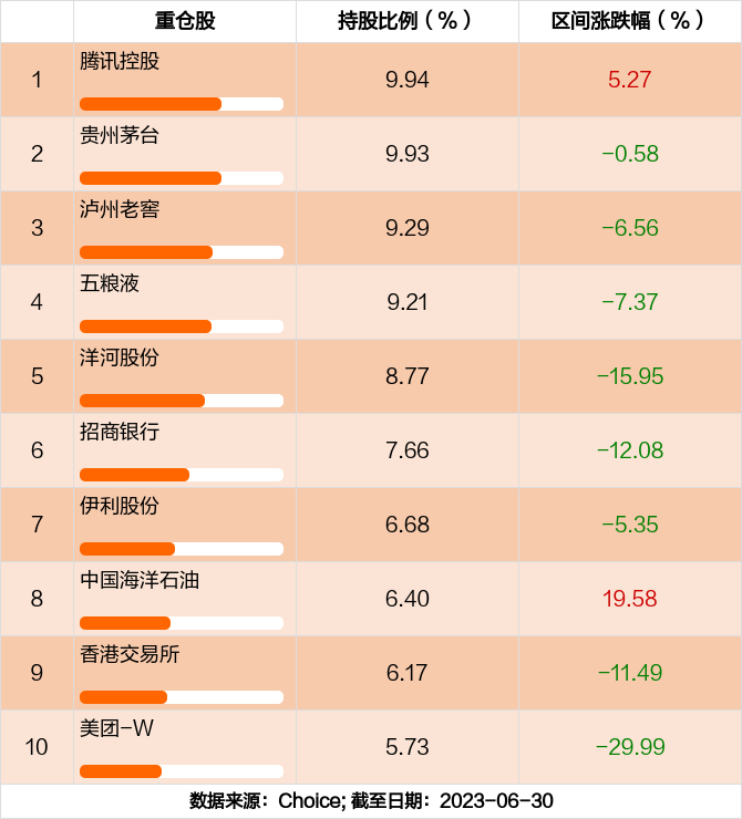 易方达蓝筹精选混合前十大重仓股分别是腾讯控股,贵州茅台,泸州老窖,五粮液,洋河股份,招商银行,伊利股份,中国海洋石油,香港交易所,美团-W,前十大重仓股合计持股占总持仓比例79.78%。