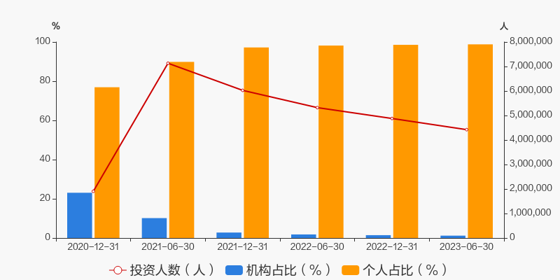 根据易方达蓝筹精选混合2023年半年报,最新持有人户数为442.25万人,较上期环比增加-9.34%。其中,个人持有者占比98.8%,机构持有者占比1.2%。