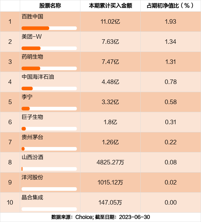本期基金累计买入金额最高的前十大个股分别是百胜中国,美团-W,药明生物,中国海洋石油,李宁,巨子生物,贵州茅台,山西汾酒,洋河股份,晶合集成。