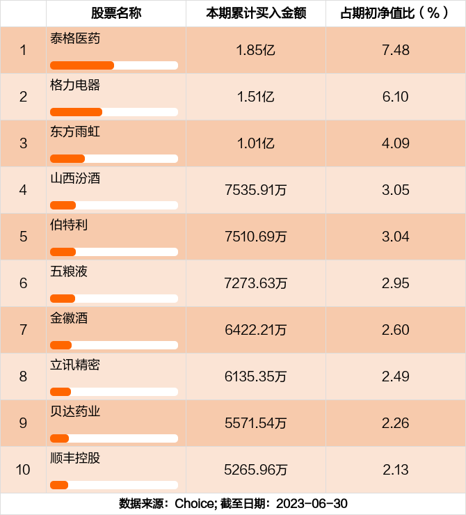 本期基金累计买入金额最高的前十大个股分别是泰格医药,格力电器,东方雨虹,山西汾酒,伯特利,五粮液,金徽酒,立讯精密,贝达药业,顺丰控股。