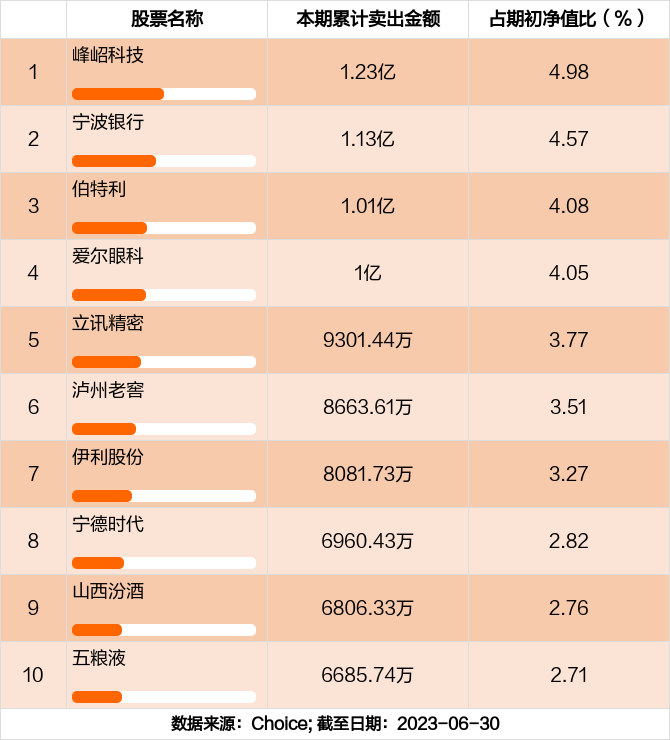 本期基金累计卖出金额最高的前十大个股分别是峰岹科技,宁波银行,伯特利,爱尔眼科,立讯精密,泸州老窖,伊利股份,宁德时代,山西汾酒,五粮液。