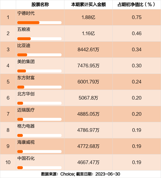 本期基金累计买入金额最高的前十大个股分别是宁德时代,五粮液,比亚迪,美的集团,东方财富,北方华创,迈瑞医疗,格力电器,海康威视,中国石化。