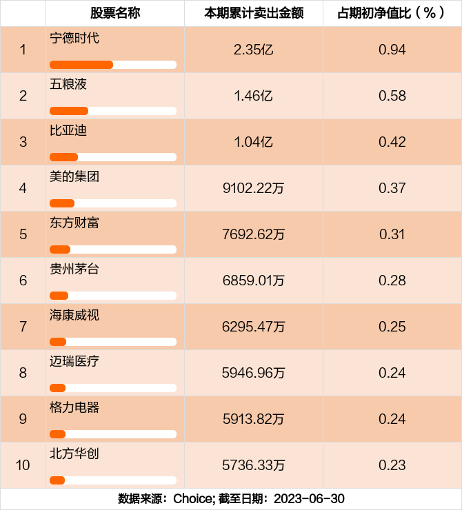 本期基金累计卖出金额最高的前十大个股分别是宁德时代,五粮液,比亚迪,美的集团,东方财富,贵州茅台,海康威视,迈瑞医疗,格力电器,北方华创。
