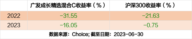2023年度,截止至6月30日,广发成长精选混合C基金收益-16.05%,同期沪深300收益-0.75%,同类排名3438/3541。
