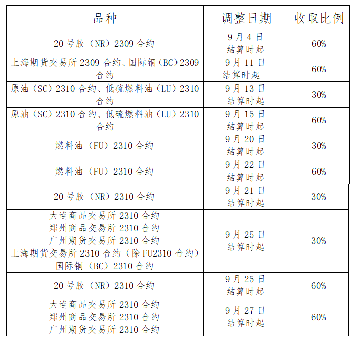 各商品期货的2310合约临近交割月,同时各商品期权品种的2310合约及股指期货、期权品种的2309合约临近最后交易日,届时交易保证金收取比例将随之变化,基于此特对您做如下提示: