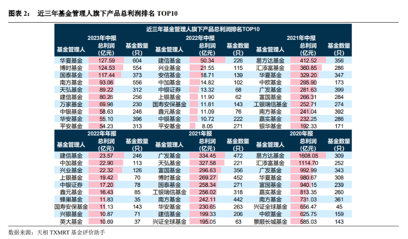 从基金管理人的角度,据天相投顾数据统计,在 154 家公募基金管理人中,共有 117 家基金管理人本期合计利润为正,其中华夏基金以 127.59 亿元位居榜首。