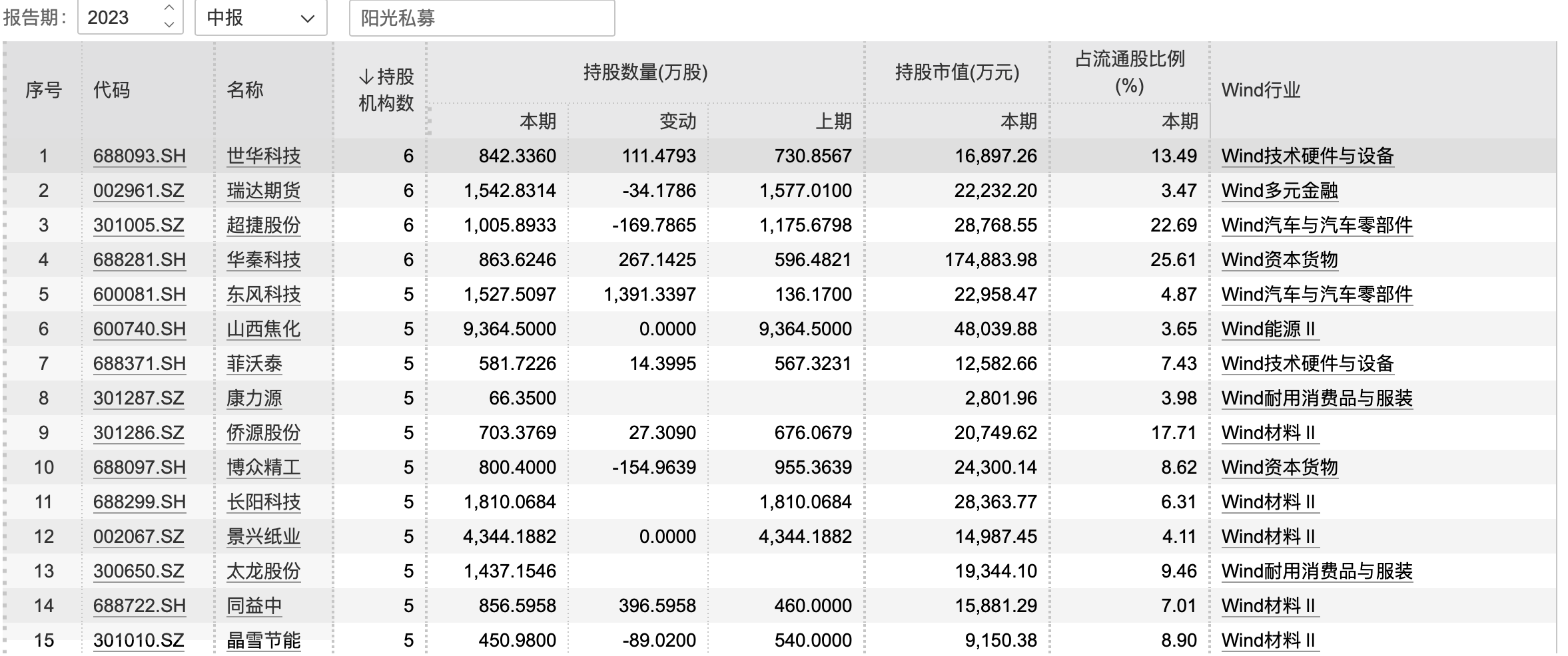 2023年二季报私募持股市值前十位