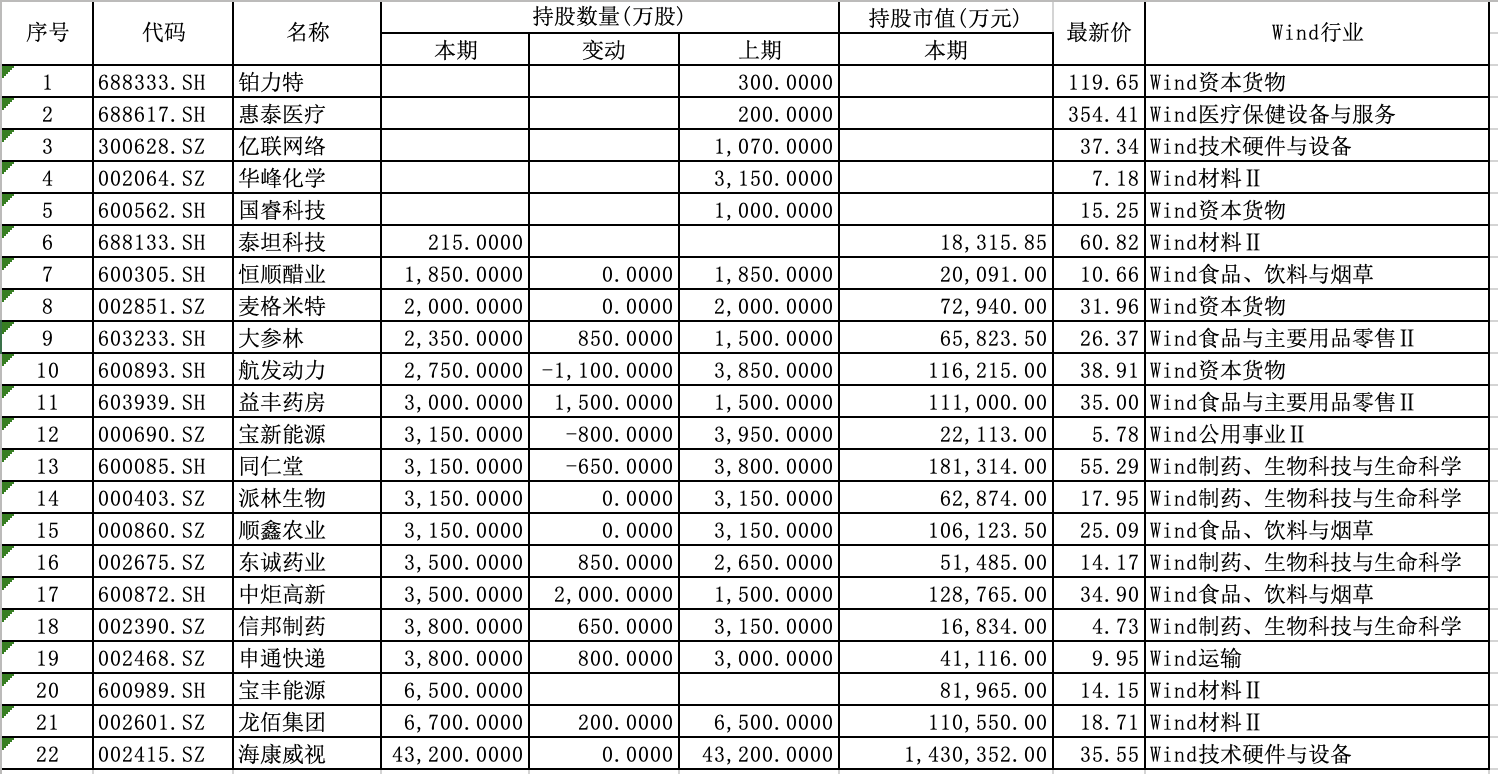 其中,冯柳持股市值最大的仍然是安防龙头——海康威视,仍然持有4.32亿股,二季度末持股市值为143亿元左右。同时,他增持了益丰药房(603939)、大参林(603233)、东诚药业(002675)、信邦制药(002390)等多只医药股,分别增持了约1500万股、850万股、850万股和650万股。