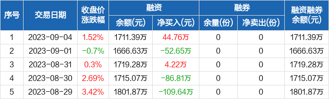 融资方面,当日融资买入48.34万元,融资偿还3.58万元,融资净买入44.76万元。融券方面,融券卖出0份,融券偿还0份,融券余量0份,融券余额0元。融资融券余额合计1711.39万元。