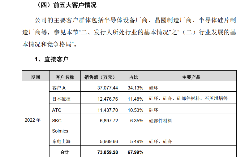 2022年,盾源聚芯直接客户中前五名分别为客户A、日本磁控、ATC、SKC Solmics和东电上海,销售额占比分别为34.13%、11.48%、10.53%、6.35%和5.49%,合计67.99%。