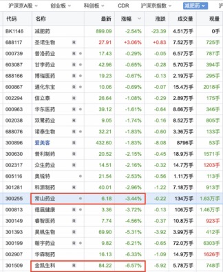 9月13日,多只减肥药个股股价开盘转跌,截至收盘,常山药业股价下跌3.44%至6.18元/股,金凯生科股价下跌6.57%至84.22元/股。值得注意的是,9月11日~12日,常山药业股价累计上涨44.14%,翰宇药业、金凯生科等个股也继续冲高。
