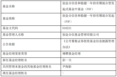 (原标题:创金合信佳和稳健一年持有期混合增聘基金经理彭一夫)