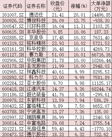 9月18日,华为汽车板块集体走强,截至收盘,其整体涨3.78%,跑赢上证指数(涨0.26%)。其中,11只概念股集体涨停,德迈仕20CM涨停,丰华股份、京泉华、铭科精技、科华控股、赛力斯、华阳集团、圣龙股份、祥鑫科技、科力尔、亚太股份等10只概念股涨停。