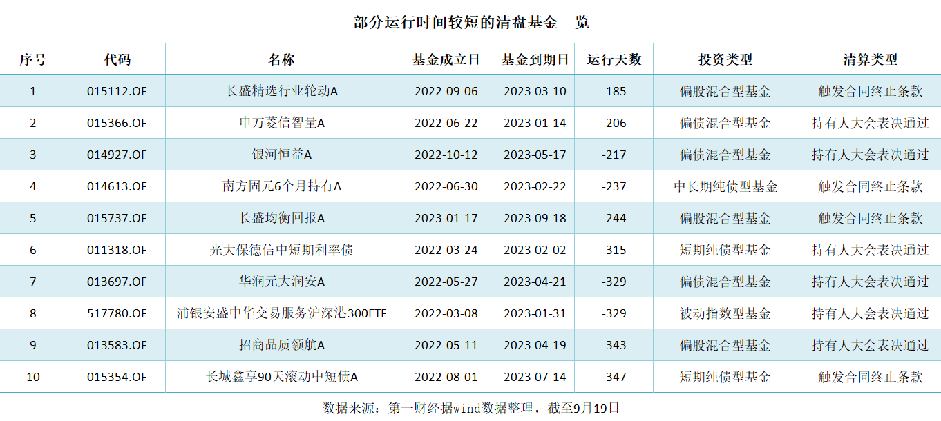具体来看,运作时间最短的是长盛精选行业轮动A,该基金成立于2022年9月,因连续50个工作日出现基金资产净值低于5000万元的情形,在3月11日进入基金财产清算程序,简单计算可知存续时间仅180余天。