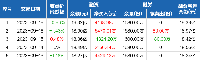 融资方面,当日融资买入1.57亿元,融资偿还1.16亿元,融资净买入4168.98万元,净买入额两市排名第13。融券方面,融券卖出0份,融券偿还0份,融券余量1680万份,融券余额690.48万元。融资融券余额合计19.39亿元。