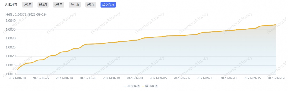 从净值走势看,该产品成立以来净值呈上行走势,尤其是成立之初至8月末净值增幅较快,截至9月19日最新净值为1.00378,兼顾了收益性和流动性。
