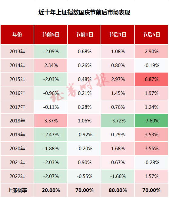 回顾近十年国庆假期前后A股表现,记者发现,节前市场成交总体比较清淡,同时指数波动也不大,节后随着持币观望者回归,市场整体上涨概率较高。
