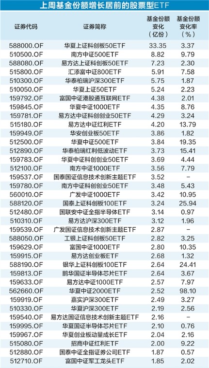 从份额变化看,上周股票型ETF份额增长超120亿份,市场越跌越买态势凸显。华夏上证科创板50ETF的份额大增33.35亿份,排在首位。南方中证500ETF份额增长8.82亿份,易方达上证科创板50ETF、汇添富中证800ETF、华泰柏瑞沪深300ETF、华夏上证50ETF等份额增长均超5亿份。