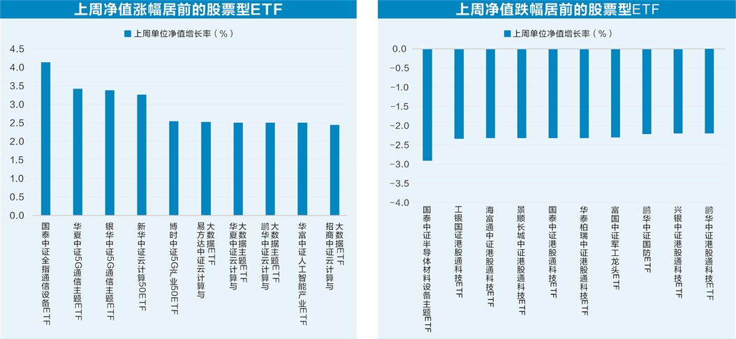 证券时报·数据宝统计,投资类型为股票型的ETF中,逾430只上周净值录得上涨,20只涨幅超2%,主要是通信行业相关ETF,且多为人工智能题材。具体来看,国泰中证全指通信设备ETF、华夏中证5G通信主题ETF、银华中证5G通信主题ETF、新华中证云计算50ETF等基金净值均涨超3%,位居涨幅榜前四,其中国泰中证全指通信设备ETF涨幅超4%,居首位,其前十大重仓股包括中兴通讯、工业富联、中际旭创、新易盛等多只人工智能概念股。