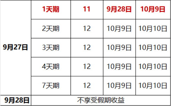 举例而言,如果投资者选择买入1天期的品种,在今年中秋、十一和周末组成的连续10天休市下,投资者可享受11天的计息时间。