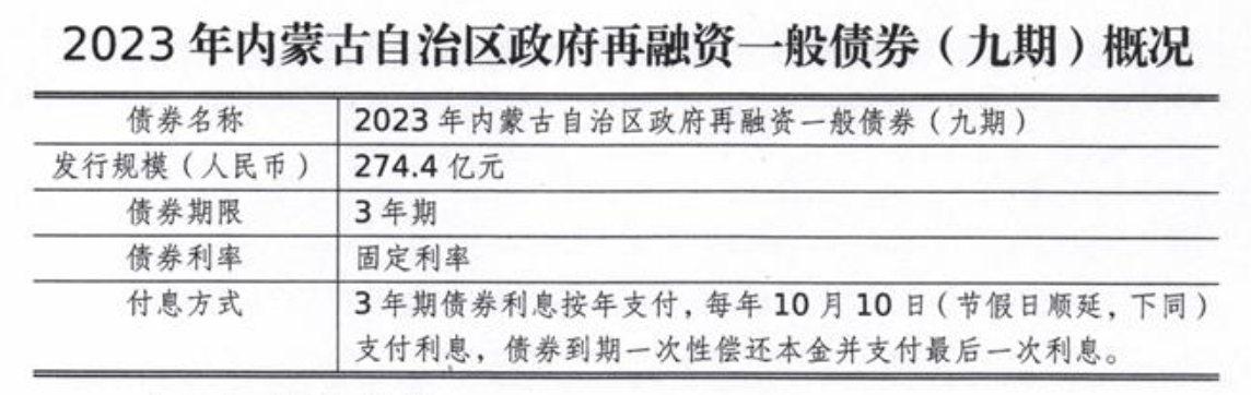 9月26日,内蒙古自治区政府再融资一般债券(九期至十一期)信息披露,三期债券拟发行总金额663.2亿元。