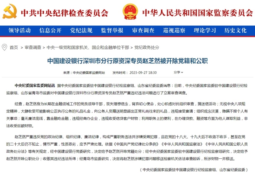 中央纪委国家监委网站9月27日讯,据中央纪委国家监委驻中国建设银行纪检监察组、山东省纪委监委消息,日前,中央纪委国家监委驻中国建设银行纪检监察组、山东省青岛市监委对中国建设银行深圳市分行原资深专员赵芝然严重违纪违法问题进行了立案审查调查。