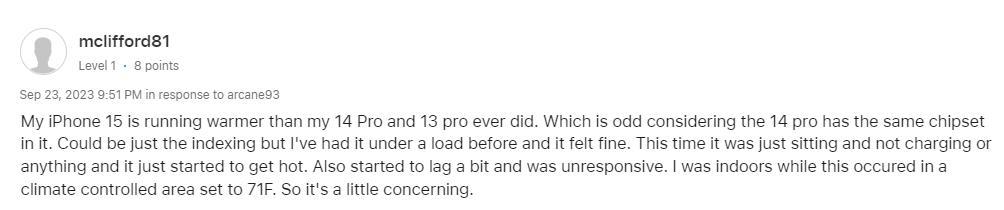 另外,根据苹果社区上部分国外网友的反映,在进行打电话、拍照、充电等操作时出现了机身温度过高的情形,甚至有多个网友称,在剩余内存空间足够大的情况下,即使不用手机也会发热。