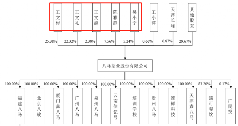 八马茶业成立于1997年,是一家全茶类全国连锁品牌企业。招股书的披露来看,公司虽注册在深圳,但实际控制人王文彬、王文礼、王文超、陈雅静及吴小宁,均来自茶文化盛行的福建泉州。其是典型的家族企业,前述股东与福建当地知名企业七匹狼、安踏、高力控股之间都存在联姻关系。