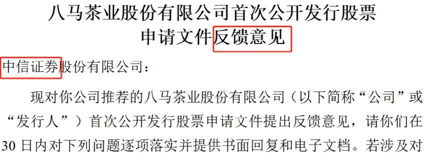 八马茶叶平移深交所审核后虽未收到问询,但在审核制下公司在今年1月12日收到过证监会的反馈意见,反馈具体对象是保荐机构中信证券。该反馈意见中,监管聚焦规范性问题、信息披露问题以及与财务会计资料相关的问题,共列出46项,要求八马茶业进行逐项落实并提供书面回复。