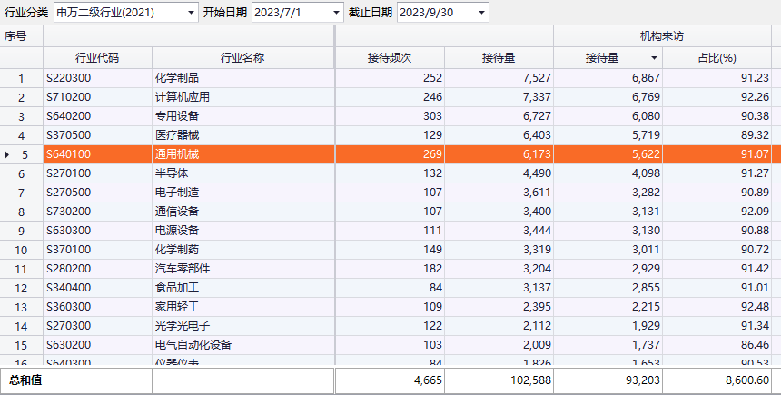 与此同时,今年三季度上市公司接待机构调研数量超9万次。其中,化学制品、计算机应用、专用设备、医疗器械和通用机械调研频次居前,机构接待量均超过6000次。
