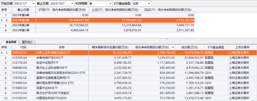 Choice数据显示,今年三季度,净申购份额最大的3只ETF分别为华夏上证科创板50成份ETF、华泰柏瑞沪深300ETF和华宝中证医疗ETF,净申购份额均超过100亿份。
