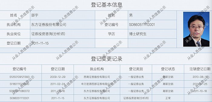 邵宇于2011年7月加入东方证券,曾担任东方证券总裁助理一职,目前已在东方证券工作12年之久。证券业协会网站显示,在加入东方证券前,邵宇曾供职于西南证券、申万宏源西部证券。简历显示,邵宇的研究领域覆盖全球宏观、中国宏观、权益债券投资策略和金融工程,曾任上海市宝山区发改委副主任,复旦大学国际金融系副主任等职。
