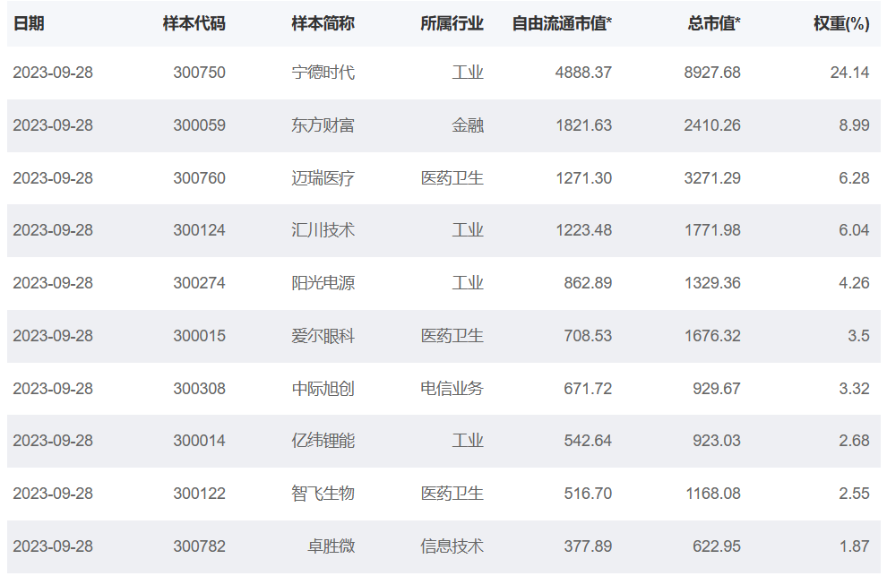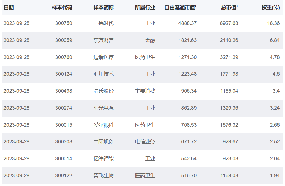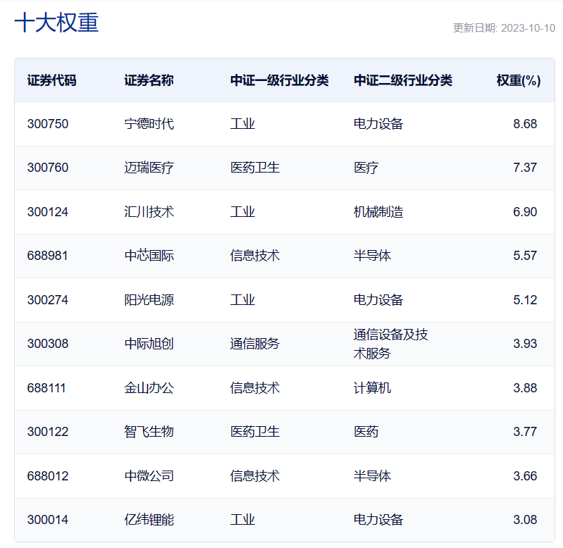 再进一步从上述三类ETF所跟踪的指数来看,首先是创业板指数,创业板指是由创业板中市值大、流动性好的100只股票组成。其中前十大权重股如下:
