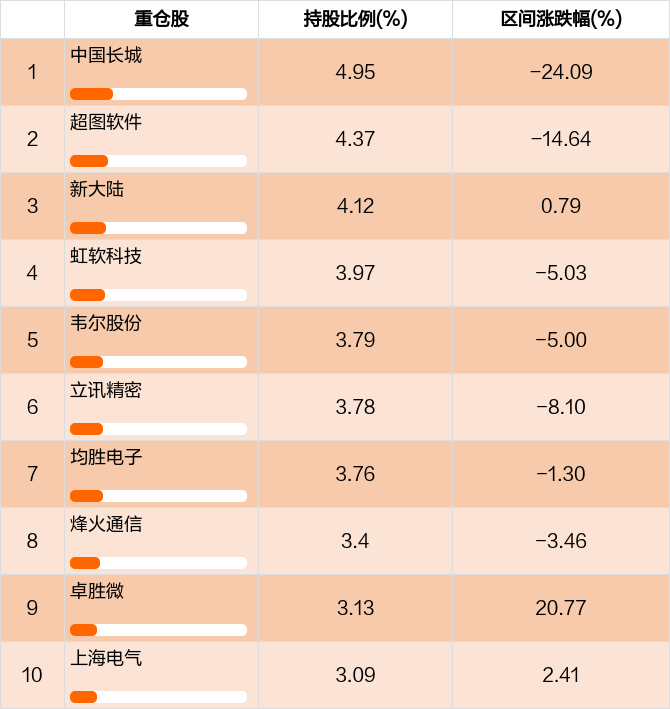 从十大重仓股情况来看,最新一期前十大重仓股占比为38.36%。