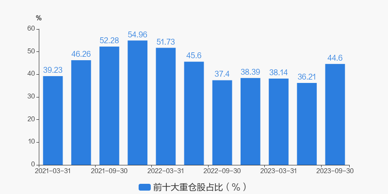 从十大重仓股情况来看,最新一期前十大重仓股占比为44.60%。